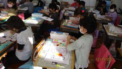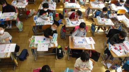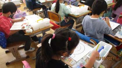 図工の時間には,絵の具で色をぬる学習をしました。グラデーションをつけながら,カタツムリに彩色していくのです。「わあ,きれいな色ができたあ。」・・・満足そうに絵筆を動かしていました。