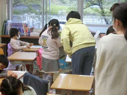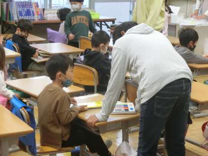 今朝の1年生の教室の様子です。6年生が1年生の登校後の片付けのお手伝いをしてくれています。温かい言葉をかけて、丁寧に関わってくれています。さすが、最上級生。