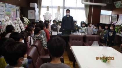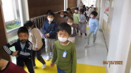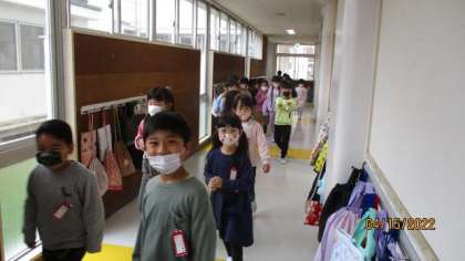 今日は、生活科の時間に、学校の中を歩いてみました。廊下の歩き方や職員室の入室の仕方などを教わりながら、学校の中をめぐりました。校長室では校長先生に励まされたり、三階からの眺めに見入ったり、わくわくしながら教室に戻ってきました。