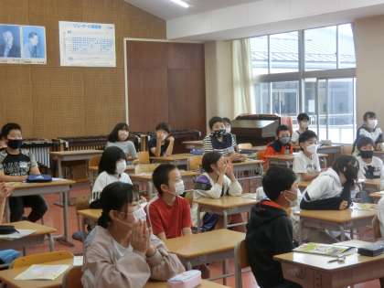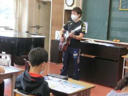 音楽の授業の様子です。今日は「こいのぼり」の歌を練習していました。伴奏は、なんと先生のギターの生演奏。素敵な音色でした。子供たちもとても嬉しそうでした。これからも、楽しく授業に取り組んでいってください。