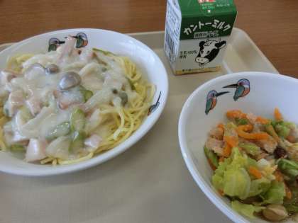 ・アスパラのクリームスパゲッティ ・まめとツナのサラダ