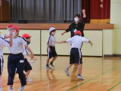 体育と外国語活動の授業です。体育では、準備運動のダンスを本当に楽しそうに行っていました。担任の先生もノリノリでした。