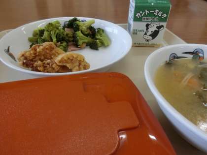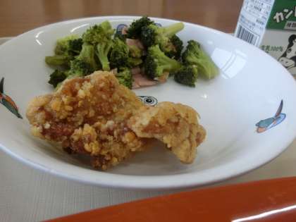 今日の給食です。子供たちが大好きな『とりの唐揚げ』です。きっと喜んで食べることでしょう。ブロッコリーのにんにく炒めも、とても美味しかったです。