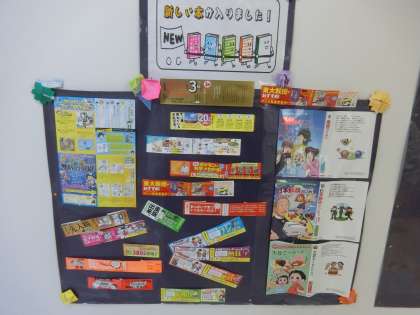 図書室前の掲示物です。司書の先生がいつも図書室の環境をきれいに整えてくださっています。ありがたいです。現在は、「図書室に入った新しい本」が紹介されています。
