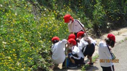 生活科の時間には、「いきものとなかよし」の学習で、外に出て学校の校舎の周りの生き物を探しました。昇降口の屋根の下にあるツバメの巣を見つけたり、キャベツ畑の上を飛ぶモンシロチョウを見つけたりしました。生き物に関心をもちながら、楽しく校舎周りを散策しました。