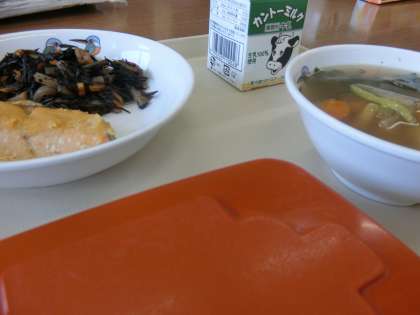 今日の給食です。鮭のネギ味噌焼き。味がしっかりついていて、しかも、あたたかくほっかほか。食が進みます。本当に美味しいです。栄養士の方と調理員の皆様に感謝!感謝!です。