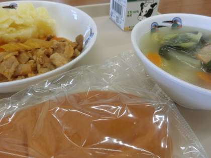 今日の給食です。出来たてのキャベツスープ。体の芯まで温まりました。こふき芋もほっかほかで美味しかったです。更に、ぶた肉もやわらかくて口の中でとろけました。