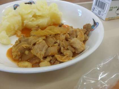・ミルクパン ・豚肉とセロリのケチャップ炒め ・こふき芋 ・ソーセージとキャベツのスープ