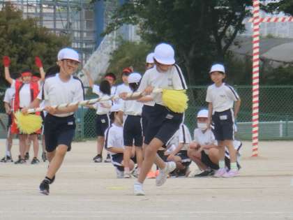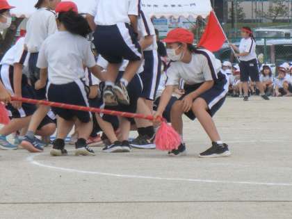 4年生の団体種目『ぐるぐるタイフーン』。協力し、工夫しながらの競技。必死に取り組む姿を見ることができました。デットヒート。大接戦!盛り上がりました。