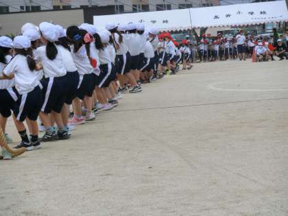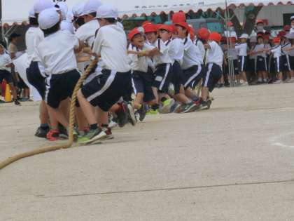3年生の団体種目。『走っていいんですか? いいんです!』。全力での綱引き。男子はグランドを半周してからのお助け綱引きです。必死になって綱を引く姿がとても印象的でした。本番も男女で協力して頑張ってください!