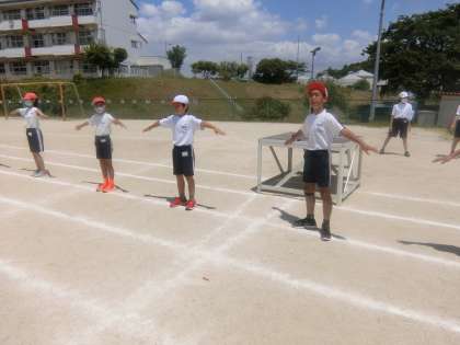 5・6年生の児童による整理運動。代表児童の素晴らしいリーダーシップで、しっかり行うことができました。5・6年生の児童の運動会にかける熱い思い。様々な場面で伝わってきます。とても頼もしく感じています。