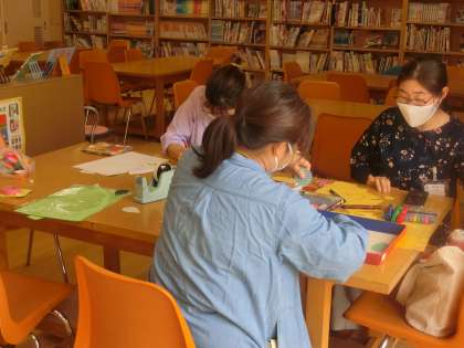 読み聞かせ終了後。『フォレスト』の皆様が、今度は図書室前の掲示物のリニューアルをしてくださっています。とてもありがたく、頭が下がります。