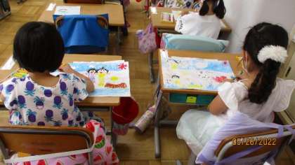 図工では「クレヨンやパスとなかよし」の学習で、ざらざらしたものを写しとった模様を生かして絵を描きました。教室や建物の外に出て、ざらざらしたものを探すのは、とても楽しい時間だったようです。「おいで、おいで。こっちのざらざらも、すごいよ〜。」・・・みんなで教えあって、夢中になって活動していました。