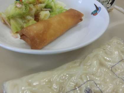 ・肉味噌ごまうどん ・肉味噌ごまスープ ・春巻き ・ハムとキャベツのサラダ