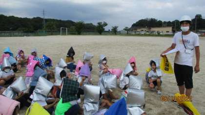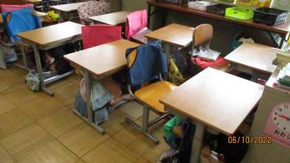 今日は、地震の避難訓練を行いました。避難の指示を受けて、机の下にもぐるときも、防災ずきんをかぶるときも、運動場に避難するときも、静かに落ち着いて行動することができました。