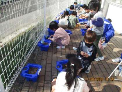 今日は、生活科の時間に、チューリップの球根うえをしました。まず、球根の観察です。「アサガオのたねとぜんぜん違うね。大きい〜。」「においは、どんな感じかな。」・・・その後は、いよいよ球根うえです。土をやわらかくして、球根を入れ、そっと土をかけていました。「おおきくなるんだよ。」・・・言葉をかけながら球根うえをしている姿が微笑ましい1年生でした。