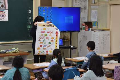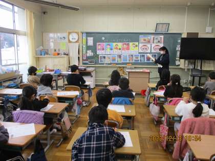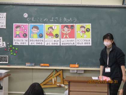12月13日(火)に食育指導がありました。子供たちはよく噛んで食べることの大切さを学び、しっかり噛んで食べることの目標を立てていました。給食の時間にも、学んだことを生かし、たくさん噛んで食べようとしていました。