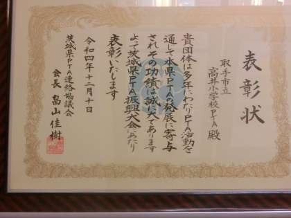 この賞状は、本部役員の皆様をはじめ高井小学校のずべての保護者の皆様の日頃からの献身的な活動を認めていただいたものです。