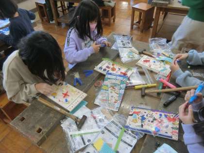 金槌と釘を使って、作品づくりを行っています。