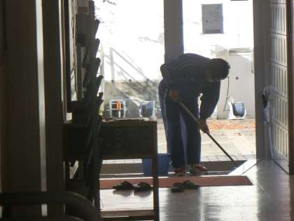 職員玄関を丁寧に掃除してくださっている先生がいます。