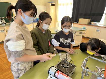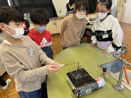 今日は、金属の体積の変化について実験しました。実験用ガスコンロを使って金属の玉を熱したり、水に冷やしたり、本格的な実験です。「うわー!色が変わってきたよ!」、「あ!輪っか、通り抜けないよ!すごーい!」などと、目を輝かせながら学習に取り組んでいました。