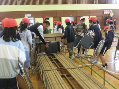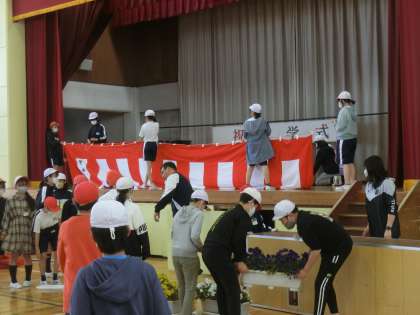 5・6年生の児童が、一生懸命、入学式の会場の片付けをしてくれています。
