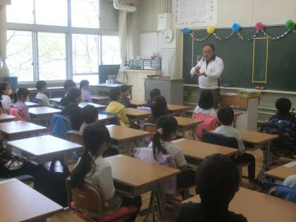 1年生の授業の様子です。はじめての給食の時間に向けて、先生の説明を真剣に聞いています。