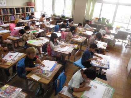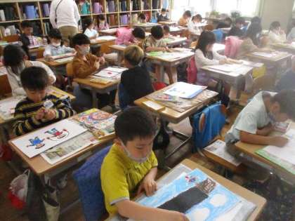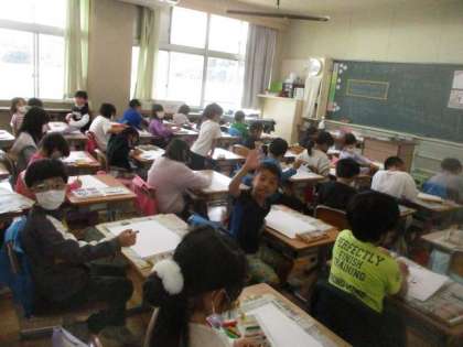 図工では、「すきなことなあに」の絵を描きました。遊んだことやがんばったこと、友達や家族としたことなど、好きなことをしている自分を絵に描くのです。「ぼくは、なんといってもなわとび。」「ドッジボールの絵を描きたいな。」・・・楽しそうにクレヨンを走らせていました。
