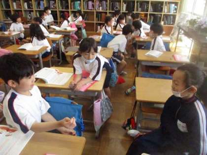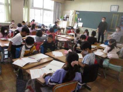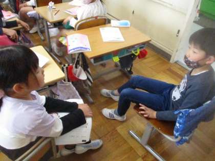 国語では、「すきなこと、なあに」の学習をしました。国語でも図工でも自分を紹介する単元から2年生の学習が始まります。国語では、友達の話を受けて、話をつなぎ、やりとりをするのですが、どのクラスでも、興味深そうに話をつないで、会話を楽しんでいました。
