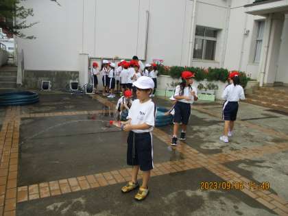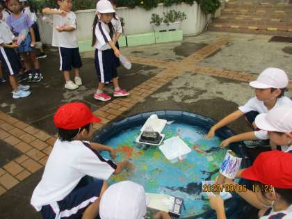 9/7生活科では、自分たちで作った水鉄砲や帆引船を使って、水遊びを楽しみました。水鉄砲では、どうやったら水が遠くに跳ぶか、友達と競争しながら楽しむ様子がありました。帆引船は、上手に浮いた児童もいれば、「もっとこうすればよかったな。」と考えながら学習に臨んでいた児童もおり、楽しみながら試行錯誤した時間にもなったようでした。材料の準備等、ご協力くださりありがとうございました。