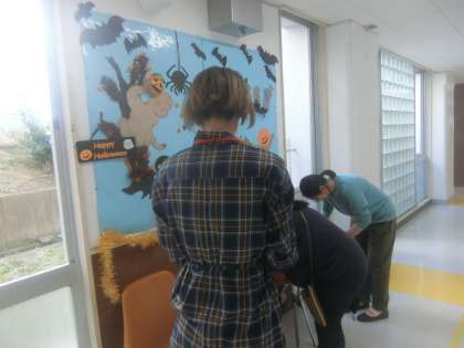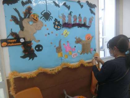 読み聞かせボランティア『フォレスト』の皆さんによる図書室前の環境づくり。