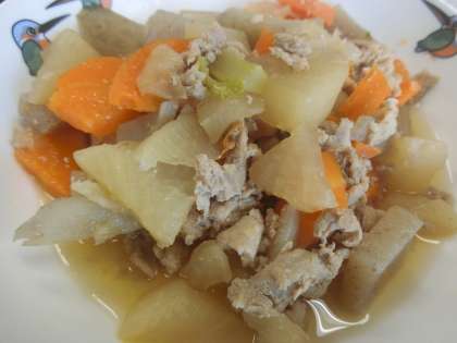 今日は、『大根と豚肉のうま煮』です。味つけが絶妙でした。ニラ玉の味噌汁もあつあつで最高でした。