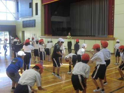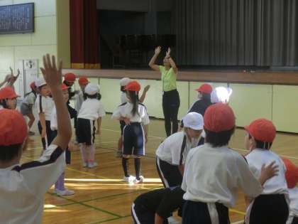 準備運動では、楽しく体を動かす運動を取り入れていました。