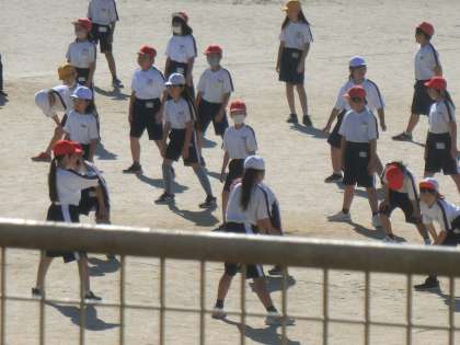 持久走を行う前の準備運動の様子です。大きな声で準備運動を行うことができています。