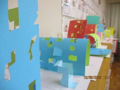 図工では、「まどのあるたてもの」の工作に取り組みました。カッターを使って色厚紙に窓を作っていきます。カッターを使うのは2回目なので、前回よりも上手に使えるようになってきました。窓が完成したら、立体にしていきます。「ドーム型にしようかな。」「窓から滑り台で外に出られるおうちなんて楽しそう。」・・・夢いっぱいの建物を楽しそうに作っていました。