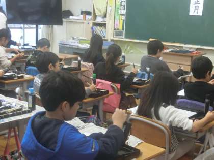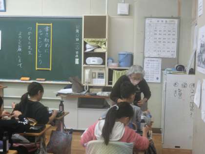 今日はゲストティーチャーをお招きして、書初めの指導をしていただいています。