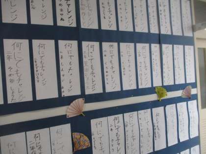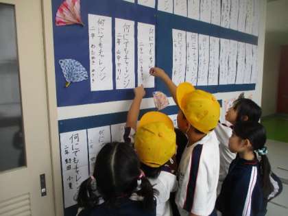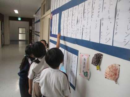 冬休みの宿題で取り組んだ書き初めが廊下に掲示されました。「この字、きれいじゃない。」「力強くていいね。」・・・子供たちも、友達の書いた作品に刺激を受けていました。