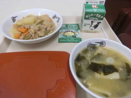 今日は『にくじゃが』。『若竹みそしる』。しかも、ふりかけ付きです。