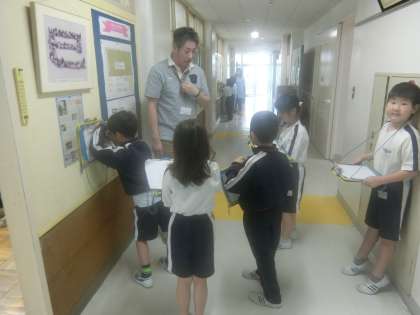 ※写真は、主査が子供たちの国語の学習のインタビューに丁寧に答えている場面です。