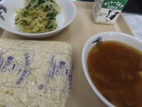 今日は『はる巻き』。『ソフト麺』。『みずなのサラダ』。『ちゃんぽんスープ』。