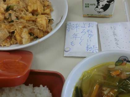 ハッピー ハッピー! 公開日 2024/06/07 更新日 2024/06/07 今日の献立 今日の給食です。 今日は『ぶたキムチいため』。『はるさめスープ』。 もう、毎日ハッピーな時間です。ありがたいです。 調理員の皆様。暑い中、朝早くからの作業本当にありがとうございます。 ※う〜ん。写真。いいね。圧倒的な安定感。(笑) お手紙ありがとう。大切にとってあるよ。😉