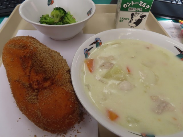 今日の給食です。今日は『クリームシチュー』、『キャラメルあげパン』、『ブロッコリーのガーリックソテー』。