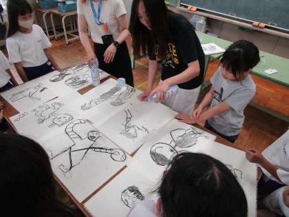 次に、木炭を使ったデッサンをしました。木炭を握る道具役と、相手の手を握って絵を描くアーティスト役を交代して体験し、すてきなデッサンがたくさんできあがりました。