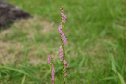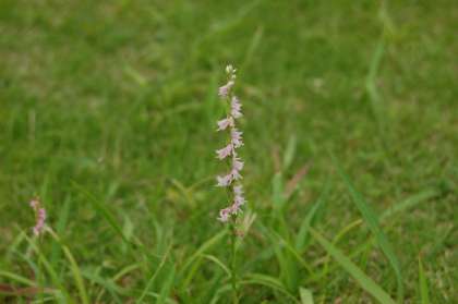 山王小の校庭のわきにある岩石園、そこの芝生には毎年、ピンクの小さな花をらせん状に咲かせる「ネジバナ」がたくさんの花を咲かせます。