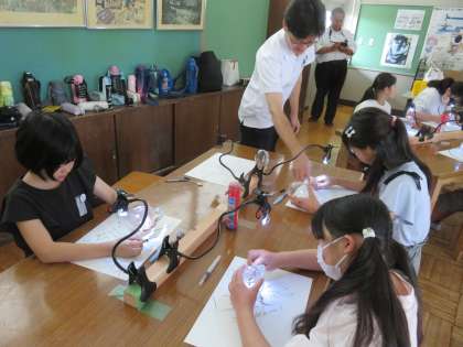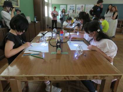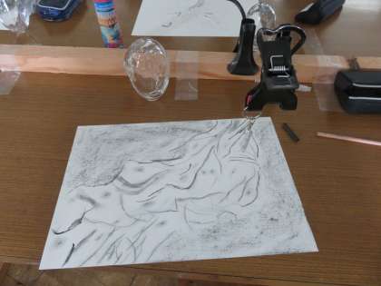 今日は、このガラスに光をあてて、見えないものの形を描きました。