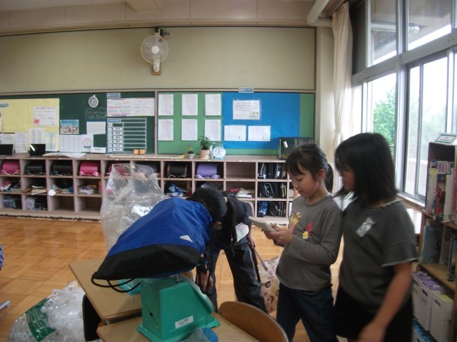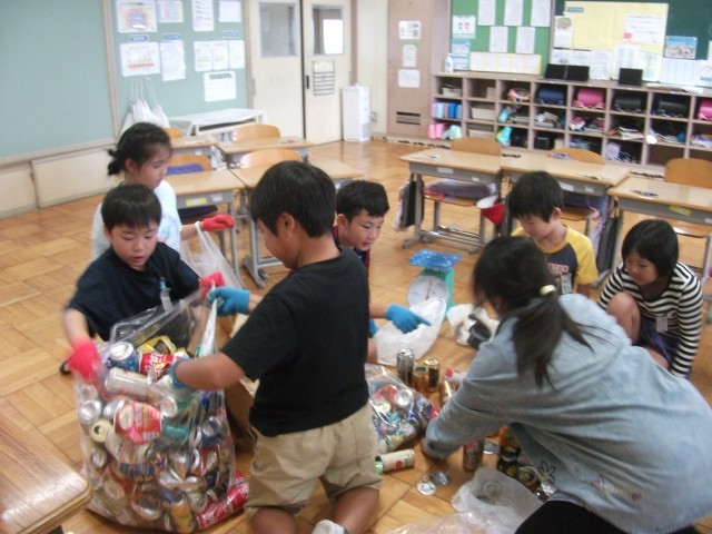 今日は2回目の報告日でした。各家庭から集めたペットボトルや空き缶を分別し、重さを量って専用のサイトに登録します。