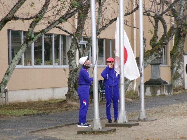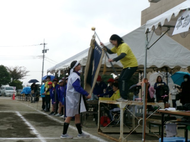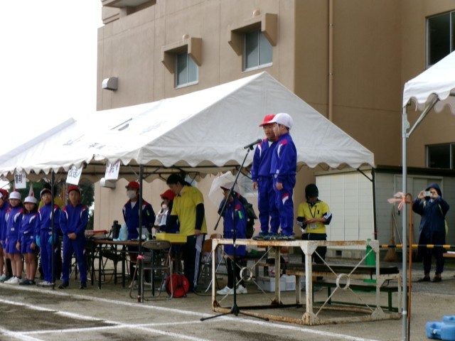 することにしました。1年生児童2名の「はじめの言葉」から始まり、国旗掲揚、優勝旗返還など