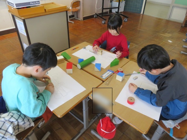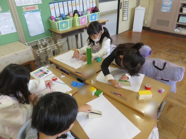 前回、箱をつなげていろいろなものを作りました。「箱ってどんな形からできてる?」と聞くと、「ながしかく!」「ましかく!」「まる!」「つつの形!」とでてきました。「今日は、その形を写して、絵をかこう!」というと「おもしろう!」という反応。積み木や箱を使ってそれぞれに楽しい絵をかいていきます。