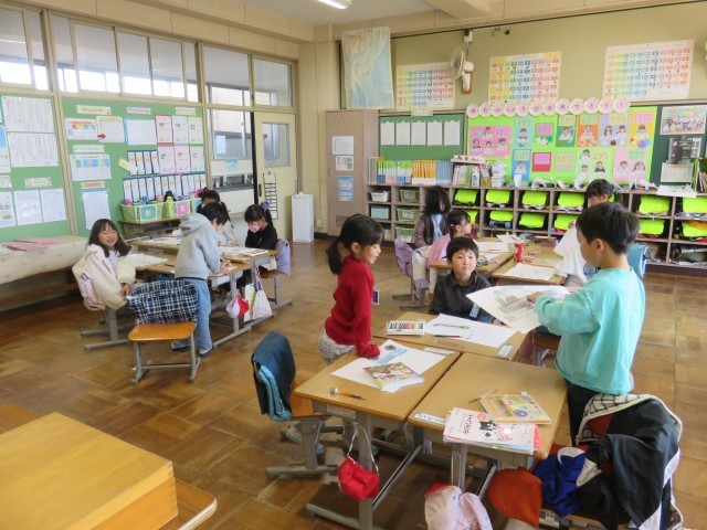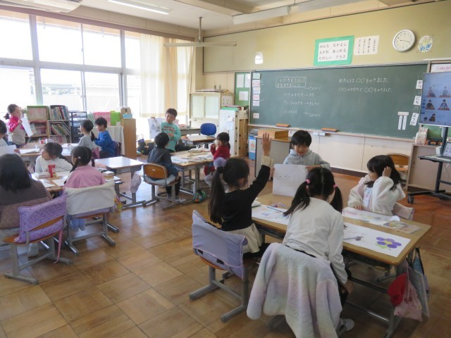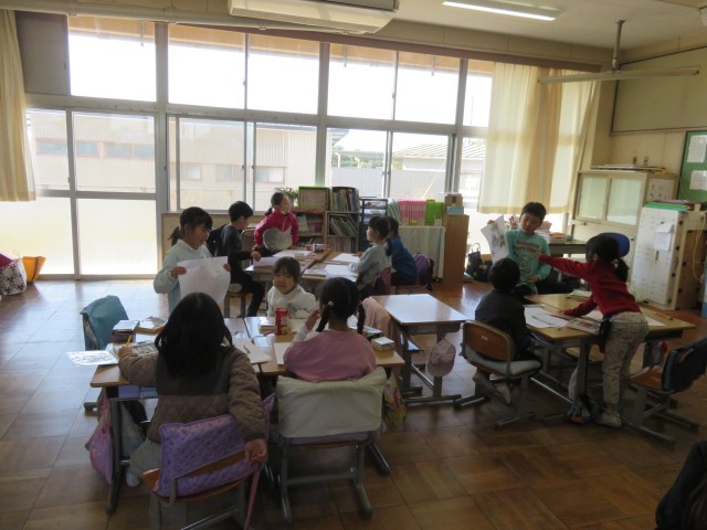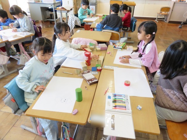 完成したら、発表会です。 「わたしは、○○をかきました。○○の形で○○をかきました。・・・」とグループの中で発表します。どのグループも楽しそうです。