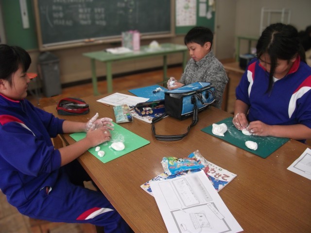 図画工作では、学校中のみんなが楽しい気分になるマスコットを考え、紙ねんどで作りはじめました。